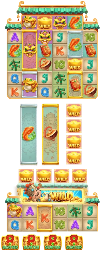 • ในระหว่างการหมุนใดๆ ก็ตาม อาจมีบล็อคสัญลักษณ์ Caishen ที่สมบูรณ์ (กว้าง 4 สัญลักษณ์) ปรากฏออกมาบนเพลาบนสุด