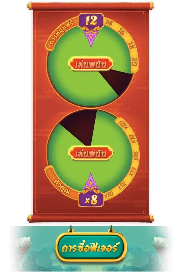 • เมื่อได้สัญลักษณ์ Scatter 4 ตัวหรือมากกว่า ปรากฏออกมาที่ใดก็ตาม ก็จะเริ่มฟีเจอร์การหมุนฟรี