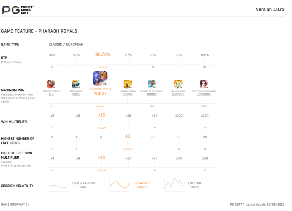Pharaoh Royals คือวิดีโอสล็อต 3 รีล 1 แถว พร้อมตัวคูณสูงสุดถึง x10 เรียกใช้ 3 ฟีเจอร์พิเศษที่น่าตื่นเต้น ได้แก่ ฟีเจอร์ตัวคูณ ฟีเจอร์สะกิด และฟีเจอร์รับประกันการชนะ! แต่ละฟีเจอร์มอบรางวัลพิเศษเพื่อเพิ่มโอกาสในการชนะของคุณ! นอกจากนี้ การรวบรวมสัญลักษณ์ Scatter 3 อันจะทำให้เกิดสิทธิ์หมุนฟรี 10 ครั้งอีกด้วย!