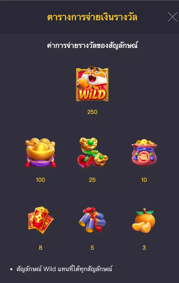 เกมสล็อตใหม่มาแรง จากค่าย PGSOFT เกมนี้เปิดตัวได้ไม่นาน ได้เสียงตอบรับอย่างล้นหลาย จากเหล่าบรรดา เซียนสล็อต ยูทูปเบอ นักปั่นสล็อต หรือ ผู้เล่นใหม่ เพราะเกมนี้ เป็นเกมที่เล่นง่าย อัตราการจ่ายสูง แตกง่าย เพราะจะมีเจ้าเสือโชคลาภ มาอวยพร โดยการ สุ่มใบแจก X10 พร้อมลุ้นตัว สัญลักษณ์ เต็มหน้าจอ เหมือนดังภาพด้านขวา จะทำให้จำนวนคูณ X10 ถ้าได้รับตัวสัญลักษ์แพง ก็จะได้รับรางวัลเยอะตาม ตัวคูณสูงสุดเกมนี้ X2500 เท่า ทุนน้อยก็ได้รับแจ๊คพ็อตได้เช่นกัน